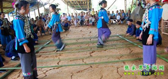 夢幻苗疆進寨必須經(jīng)過苗族人民接待遠方賓客的歡迎儀式“攔門三卡” 唱攔門歌、喝攔門酒、敲苗家花鼓,通過后,方能進寨。