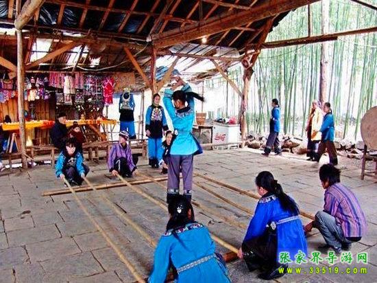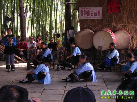 進(jìn)入鳳凰香爐山苗寨必須過三道關(guān):一是去剿匪,二是對(duì)山歌,三是喝三碗米酒。如果過不了這三道關(guān),是不能進(jìn)寨子的。剿匪就是過一道山洞(當(dāng)年土匪躲藏的地方),也就是拍攝電影《湘西剿匪記》的現(xiàn)場,洞內(nèi)驚險(xiǎn)崎嶇,道路難走,還要過一條河,河面上的橋是用小木板釘成,僅一米寬,上面滴水,橋上很滑,橋下流水很急。