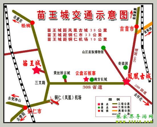 2、銅仁方向:自銅仁火車(chē)站往湖南方向經(jīng)過(guò)銅仁鳳凰飛機(jī)場(chǎng)附近(20公里處)、三岔路(23公里處)、蔬菜基地百合基地(26公里處)、中國(guó)苗王城牌樓(30公里處)、苗王茶園(30公里處)、苗王城生態(tài)農(nóng)業(yè)觀光點(diǎn)(桃林、金果林)、苗王城停車(chē)場(chǎng)售票處(33公里處)。