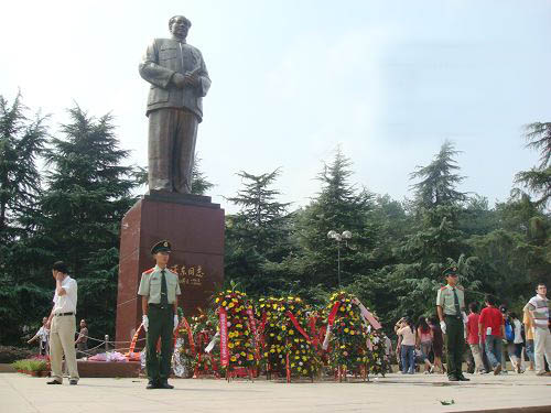 毛澤東銅像位于韶山沖的中心,紀(jì)念館、毛氏宗祠與韶山賓館之間。銅像區(qū)占地5200平方米,是經(jīng)中共中央批準(zhǔn)興建紀(jì)念毛澤東同志誕辰100周年的重點獻(xiàn)禮工程。這里原是一片沃野,地勢平坦開闊,周圍群山拱護(hù)。韶蜂在遠(yuǎn)處,高峻挺拔,云富坨大山巍峨雄壯,十八羅漢山逶迤綿長,黑石寨鐵骨錚錚。在山的襯托下,銅像更顯得氣勢磅礴。
