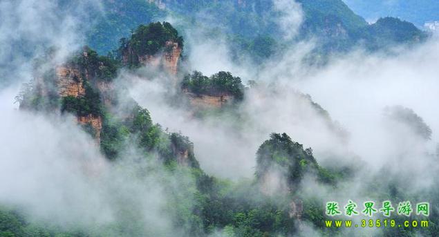 鷂子寨頂北沿有數(shù)處懸崖凌空凸出如臺。立臺鳥瞰,深谷陡峭如切,深達300多米,谷內(nèi)數(shù)十座石峰拔地而起,有如塔林。峰壁有的赭紅,有的灰白,均有節(jié)理橫斷,層次重疊。峰林直徑大者十多米,小者數(shù)米,或高或低,參差錯落。有的上粗下細(xì),有的下大上尖,有的渾圓平齊,陽光照射下均熠輝閃爍。峰頂或老松一叢,蒼勁挺拔,或灌木一片,蒼翠簇?fù)怼S晏煸旗F如濤,峰頂懸浮。此景即清乾隆《永定縣志》所記之“層巖涌塔”。