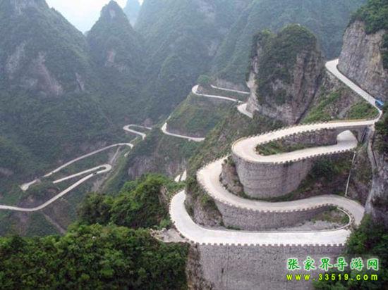 極具險(xiǎn)絕奇觀的天門山盤山公路——“通天大道”則是天門山的另一壯景。通天大道態(tài)勢險(xiǎn)絕,蕩氣回腸,更以蜿蜒迂回穿行于山體絕壁之天險(xiǎn)而“堪稱天下第一公路奇觀”。它全長10.77公里 ,從標(biāo)志門直達(dá)天門洞腳下,海拔從200米急劇提升至1300米,共有九十九個(gè)彎,大道兩側(cè)絕壁千仞,空谷幽深,180度的急彎此消而彼長,層層疊起,中國書法協(xié)會(huì)常務(wù)副會(huì)長 沈鵬 先生走過通天大道后欣然為其題字“曲道通天”,字體遒勁挺拔,與通天大道的奇絕天下相融為一體。