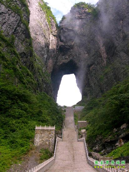 天門洞位于天門山山體的中上部,是世界上最高海拔的天然穿山溶洞,海拔1300米 ,其高131.5米,寬57米 ,深60米。它南北對(duì)開于千尋素壁之上,扶搖而通天,似明鏡似天門鑲嵌于蔚蔚天幕之上,終年吞云吐霧,蔚為壯觀中更加神秘莫測。“天門洞開云氣通,江東峨眉皆下風(fēng)”元朝的著名詩人張兌曾這樣贊嘆,磅礴的氣勢由此可見。1700多年來,這一道奇絕天下的勝景吸引著無數(shù)的探訪者趨之若騖。特別是在1999年,世界特技飛行大師架機(jī)穿越天門洞,在全球引發(fā)了轟動(dòng)效應(yīng),收看現(xiàn)場直播的觀眾達(dá)到8億之多。