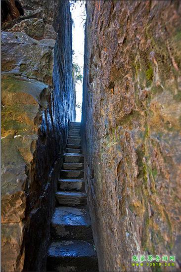 要繼續(xù)前進的路,悄然間已不那么分明,鉆洞繞石,似路非路,幾米外便難見人,百余米的路,艱難曲折,人需要彎腰才能上行。第二道鬼門關(guān)“誰能不低頭”便擋道于此。近百米的陡坡幾近直立,石路從兩塊巨石間穿過,人須側(cè)身才能慢慢上行,一夫當(dāng)關(guān),萬夫莫開。“一夫關(guān)”是第三道鬼門關(guān)。烏龍寨能立足多年,并非徒有虛名。
