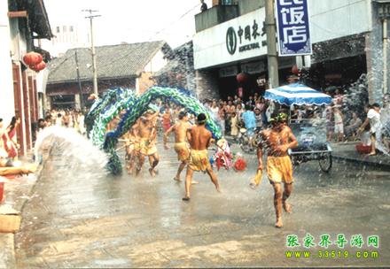 張家界潑水龍又叫“澆水龍”,于唐朝時(shí)期由移居本地的白族興起演變而成,在永定區(qū)的尹家溪鎮(zhèn)西尹村、莫家崗村十分盛行,是當(dāng)?shù)?a class="insidelink" href="http://m.fz-dnw.com/fengqing/" title="土家族">土家族,白族、苗族在天熱干旱時(shí)節(jié)求雨祈福的一種形式。一旦出現(xiàn)旱災(zāi),當(dāng)?shù)仡^面人物就會(huì)出來(lái)組織潑水龍,演出極其隆重。