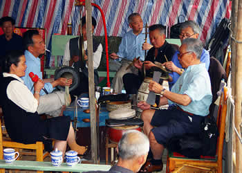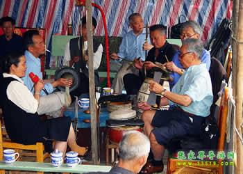 圍鼓(含嗩吶)。又稱打鎦子、打排鼓,是民間紅白會中不可缺少的樂器。一般7人演奏,樂器有一鼓、一大鑼、一公鑼、兩副鈸、兩嗩吶。其詞曲紅白會通用,以鼓和嗩吶上系紅、白布為分別標記(結婚不打“四字鈸”曲)。史傳的圍鼓詞有《撩子》、《火鋪》等,《撩子》分《一二三》、《閃翅》、《堆羅漢》、《反落花》等十章,《火鋪》也分《三槍》、《四進門》、《八哥洗澡》、《蓮魚吐絲》等十章,嗩吶詞有《八十正宮》調等。在農村,圍鼓是最普及的樂器,每逢紅白喜事都有圍鼓和嗩吶表演。