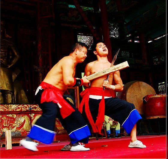 大庸氣,堪稱武林奇葩,曾為祖國贏得聲譽(yù),海內(nèi)外享有極主名望。 大庸氣功是大庸各民族特別是土家族傳統(tǒng)體育項 目之了,分健體氣派、武術(shù)氣功兩類。前者有“返還 功”、“馬王推氣功”、“少林達(dá)摩醫(yī)療保健氣功” 等;后者有靜坐、壁虎、靈子、二指彈、碎石、松靜 、硬氣、五禽、五陽功等,尤以硬氣功著稱。大庸硬 氣功,歷史悠久,漢代相單程,明代覃后,清代劉明 燈,當(dāng)代湯子模、周鐵鞭、杜心武、趙繼書等都具有 超人硬氣武功。大庸土著民族在漫長的反征服、反壓 迫斗爭,博采武當(dāng)、少林南北派、昆侖派眾家武林精 華,創(chuàng)造出獨(dú)此一家的大庸硬氣功。 據(jù)傳,大庸硬氣功鼻祖是楚國鬼谷子?!队蓝h 志》有關(guān)鬼谷子隱居天門山鬼谷洞潛心學(xué)《易》、傳 授方術(shù)的記載。到清代有武林高手朱茂嶺,隱居三岔 村北芭蕉灣洞,研究鬼谷氣功之術(shù),后收西溪坪胡口 子、余世萬(即“余通人”)為徙,傳其衣缽。余通 人將武術(shù)氣功系統(tǒng)整理,發(fā)揚(yáng)光大,播名于世。 新中國成立后,黨和政府十分重視民間氣功發(fā)掘 整理,并正式列為體育項目加以普及發(fā)展,今日大庸 市習(xí)練硬氣功達(dá)數(shù)萬人眾。永定區(qū)官黎坪村世有“硬 氣功之鄉(xiāng)”盛譽(yù),該村男女老幼,練功已蔚成風(fēng)氣, 其武師趙繼書,1979年先后參加全省和全國武術(shù)大賽 ,均獲一等獎,受到國家體委重視,同年7 月趙繼書 專程到北京給中央領(lǐng)導(dǎo)同志匯報表演。嗣后,隨同中 國武術(shù)代表團(tuán)和國家領(lǐng)導(dǎo)人先后兩次出國,到盧森堡 、意大利、比利時、羅馬尼亞、馬其他和東南亞等國 家訪問。他表演的臥刀碎石、頭頂開石、雙鳳灌耳、 頭碰石柱、叉尖推磨等精彩節(jié)目,博得外國友人好評 。盧森堡一位榮獲國家獎牌的武士,看了表演后連夜 來到中國大使館,將自己珍藏多年的獎牌贈送給他; 盧森堡國王主動熱情走上臺與趙繼書熱情擁抱,連連 稱贊:“了不起!了不起!國際氣功大師!”并把珍 藏紀(jì)念章一枚贈送給趙繼書。一位法國朋友十分贊賞 說:“中國的氣功,稱為全人類的寶貴財富,是有科 學(xué)道理的。”自此,大庸硬氣功譽(yù)滿全球。湖南瀟湘 電影制片廠專門拍攝了彩色紀(jì)錄片《大庸氣功》。 大庸硬氣功共有二十多個項目,最有影響的是: 腹臥鋼叉 由二人在地面扶住一根叉尖朝上的三 股鋼叉,叉尖猁鋒利,然后一個俯身叉尖,尖抵腹部 ,待其四肢平展懸空,扶叉二人轉(zhuǎn)動鋼叉,謂之推磨 。表演時,要求臥叉者運(yùn)氣于腹,氣意集中,稍有大 意,叉即穿腹而過。 臥刀破石 先固定兩把大刀,刀口朝上,臥刀者 運(yùn)氣后,由其他人抬臥于刀口上(有仰臥、俯臥兩種) ,然后在臥刀者腹部或背部置一碩大石條(約數(shù)百斤) ,一人或兩人輪大鐵錘狠擊石條直至斷裂破碎為止。 釘?shù)洞财剖?地上倒一層碎玻璃片,一人仰臥其 上;然后腹上置釘床,又一人仰臥釘床上,再于第二 人腹上置釘床,第三人仰臥刀床上,腹部上壓一塊數(shù) 百斤大條石,由人掄錘狠砸,至石破為止。 銀槍刺喉 用一根兩頭安有鋒利槍頭的鋼槍,抵 置兩位表演者喉部,然后相對發(fā)力,至槍桿抵成彎弓 形而喉部安然無恙。 徙手?jǐn)嗍?表演者將堅滑如鐵一塊卵石置于石凳 (地)上,然后運(yùn)氣于掌或指擊斷(碎)卵石。 踢腿斬石 表演者運(yùn)氣于腿,以腿踢斷石條。一 般可踢斷15公分以上厚度的麻石條或青石條。 胸部打刀 將鋒利大刀刃口置于胸部肌肉上,用 一根拳頭粗木棒猛擊刀背,至棒斷而胸部無傷。 新中國成立以來,大庸民間武術(shù)與民族體育逐漸 融為一體,發(fā)揮著提高人民身體素質(zhì)、弘揚(yáng)中華武術(shù) 傳統(tǒng)和增進(jìn)國際友誼重大作用。除硬氣功外,還有數(shù) 十種武術(shù)形式散見于民間武術(shù)體育活動之中。如打飛 棒、扭扁擔(dān)、抵搭斗杠、擠油渣、甩抱腰、舉石鎖、 板牛角(一種斗牛形式)等等。其特點(diǎn)是因地制宜, 不分場地,凡田園地角院壩集鎮(zhèn),都是習(xí)武練功、開 展活動的處所,頗具泥土氣息。擬或以生活中某些動 作和動物的某種形態(tài),稍加模仿演繹,便成某一獨(dú)特 武術(shù)形式。如天門武術(shù)功夫大師余道人所創(chuàng)造的“宮 天梳”、“巖燕樸天門”等;也有就地理特點(diǎn)創(chuàng)造某 種武功形式的,如“蕩藤”等。