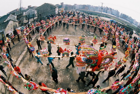 龍舞是中國(guó)民間體育藝術(shù)。大庸境內(nèi)的板凳龍是 別具一格的龍舞形式。尤其桑植縣白族人民,對(duì)舞板 凳龍有著特殊偏愛(ài)。 白族同胞耍板凳龍,相傳起于漢代,由白族先民 “舞龍求雨”的宗教活動(dòng)演變而來(lái)。 板凳龍有兩種樣式。一種是簡(jiǎn)式板凳龍,由二個(gè) 舉長(zhǎng)凳為頭,一人在后選適當(dāng)“舞臺(tái)”表演;另一種 是“篾扎板凳龍”,即用竹篾扎成龍形置于板凳之上 ,以木腳示龍爪,造型美觀,逼真。耍板凳龍又分兩 種舞式,一為獨(dú)凳龍,一為九節(jié)龍(九張板凳相接)。 舞板凳龍動(dòng)作有“二龍搶珠”、“黃龍穿花”、“二 龍戲水”、“金蟬脫殼”、“黃龍盤身”等。永順、 慈利還流行草把龍,其龍耳稻草扎成。龍舞還有“干 龍”、“濕龍”之分,“干龍”多為娛樂(lè),“濕龍” 則為求雨。“龍”到之處,百姓必潑水助威,舞者一 身透濕,盛為熱烈歡快。