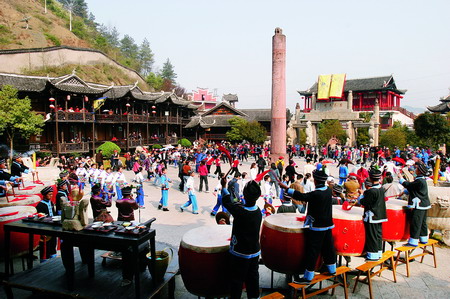 三棒鼓,唐代稱三仗鼓,明沈行符《顧曲雜言》 曰:“吳下何來(lái)有打三棒鼓乞錢者,余幼時(shí)有見(jiàn)之也, 起于唐咸通中(公元865年)”約于明代傳入本境, 并逐漸成為群眾增聞樂(lè)見(jiàn)的民間藝術(shù)形式。每年春節(jié) ,藝人們結(jié)伴走村竄寨拜年,表演對(duì)象不分貧富,戶 戶必到。如遇貧寒之家,表演者將別家贈(zèng)送禮品相送 ,意在人人過(guò)節(jié)歡喜。充分體現(xiàn)出土家族人熱情好客 ,心地善良的民族性格,對(duì)加強(qiáng)民族團(tuán)結(jié)有一定作用 。 三棒鼓通常由三至五人組成,一人擊鼓唱詞,一 人鑼鈸配樂(lè),一人?;ò簟;ò羧L(zhǎng)一尺,舞者 左右手各持一根,將另一根拋在空中,左右開(kāi)弓,擊 打空中花棒使之不落地。也有以刀代棒,以五刀代三 棒的技藝。技藝高強(qiáng)者,突然把刀拋得極高,來(lái)一個(gè) 眼花繚亂,不禁稱絕。打三棒鼓,通常有“鬧春耕” 、“收割打場(chǎng)”、“慶豐收”、“拜年節(jié)”四套,分 “鯉魚跳龍門”、“玉女穿梭”、“板巖漂灘”等項(xiàng) 目。打三棒鼓技巧性強(qiáng),表演時(shí)需高度集中,用力適 當(dāng),貫通一氣,并與演唱者默默配合。