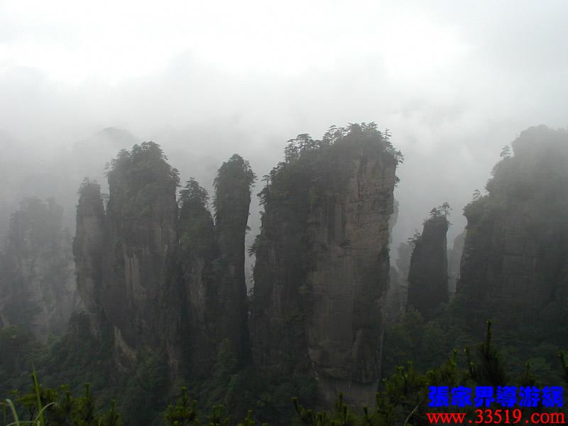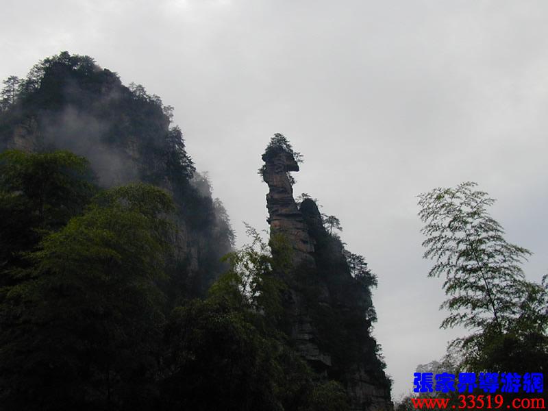 在整個(gè)武陵源風(fēng)景名勝區(qū),類(lèi)似“天書(shū)寶匣”這種形態(tài)各一的景觀比比皆是。因此,您盡可以發(fā)揮各自的想像力,給它們?nèi)∫粋€(gè)有意思的名字。大家看,右前方那座高高的石峰,像不像掛著的一塊石碑?那就是龜精倉(cāng)惶中丟下的天書(shū),民間叫“天書(shū)高掛”,三個(gè)山峰之間正中的那個(gè)山峰,像不像只報(bào)曉的金雞?傳說(shuō)龜精盜天書(shū)之時(shí),正趕上金雞報(bào)曉,故名金雞報(bào)曉。