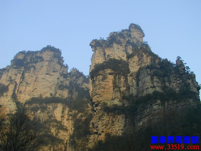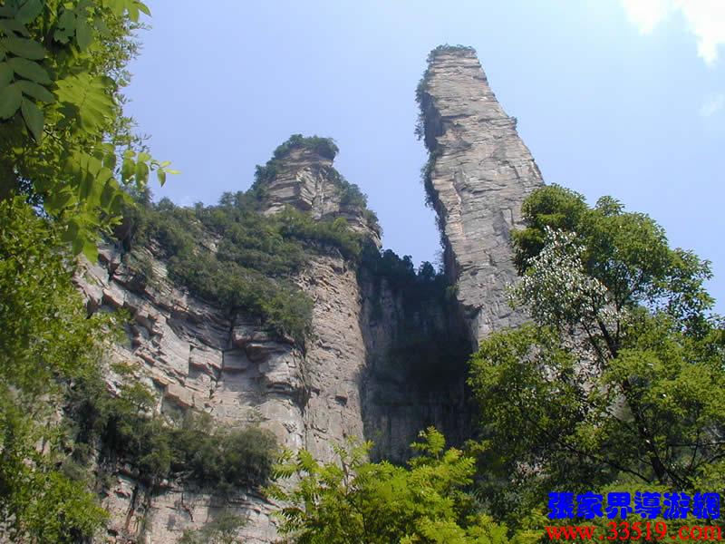 (金鞭巖、神鷹護鞭)如果要問張家界國家森林公園的標(biāo)志景點,答案是現(xiàn)成的:金鞭巖。早在清代中期,一些文人就把張家界的峰林及百丈峽列入“永定八景”。其一叫“危峽啼猿”;其二叫“層巖涌塔”:“縣西二十里青崖山,其前五山并立,層峙如浮圖。中一峰更峻拔,上插宵漢,晴輝雪積,最擅奇觀。”這里說的“其中一峰”,指的金鞭巖。八大景點張家界占其二,可見先人是有眼力的。金鞭巖相對高度380多米,拔地而起,直插云霄,無論你遠(yuǎn)看近看,正看側(cè)看,都是一根刺破青天的長鞭!在金鞭巖左側(cè)的那座巖峰,大家看多像一只兇猛的老鷹,勾嘴瞪眼,雙翅略展,時刻警覺地守護著金鞭,人稱“神鷹護鞭”。