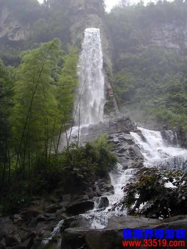 (聽瀑樓)朋友們,寶峰湖游結束了,大家一路辛苦了。現(xiàn)在,我提議到“聽瀑樓”歇歇腳,洗洗汗,聽聽音樂,養(yǎng)好精神再趕路。你們看這民族式建筑,背依砂巖石峰,面朝寶峰飛瀑,登斯樓也,品土家之香茶,聽瀑布之濤聲,此情此景,怎不令人感嘆人與自然傾心交談的空靈境界?