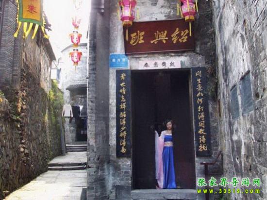 紹興班,位于余家沖,系清代青樓。 始建于清咸豐末年(1860年),是一座四周用封火墻圍護的木質(zhì)穿斗式的結(jié)構(gòu)建筑,單檐重層,兩進三層,各層樓道封閉,分隔有致。各房間置有暗門。具有極其隱蔽的行業(yè)特征。面闊較寬。有濕天井和干天井兩個。通風(fēng)采光效果較佳。木窗均有雕花,且式樣各異。地面分別用青石板和杉木板鋪就,房間屋面均用洪油漆刷,整體形態(tài)完好。近作局部保護性維修;增添了相關(guān)實物布置和表演節(jié)目,對游客開放。