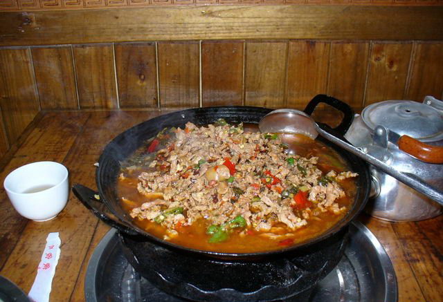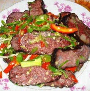 介紹: 血豆腐,就是將豆腐和豬血、豬肉及花椒、辣椒等佐料拌成泥狀,捋成卵形,以竹篩置火炕上,煙熏烤成臘黃,吃起來耐嚼味香,是土家特色菜,當(dāng)?shù)厝顺R云湎戮啤?在張家界的飯館里很難吃到正宗的土家特色菜,可以去做土味的特色餐館去解解饞。但是最正宗還是鄉(xiāng)下人家家里自己熏的,那才叫一個(gè)好吃?。。?/p>