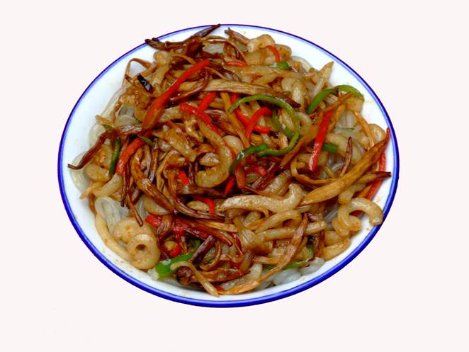 《張家界草帽面》。 這個(gè)名字的由來是因?yàn)槔习宄D甏髦菝辟u面,臊子非常香,可以添加,面是他自己加工的據(jù)說是全手工的,老板人很古怪,每天只賣那么一點(diǎn),以前更古怪,只有星期1、3、5的晚上9點(diǎn)才有賣,想吃他家的草帽面居然還得跟他打電話問他是否心情好,出不出來賣面?預(yù)約了才不會(huì)撲空。但是就因?yàn)檫@點(diǎn)神秘,所以他家的面有些神話色彩。在汽車站口百貨大樓東門對面的巷子口,一輛板車上面掛了一頂草帽,那就是了,不過每天下午1點(diǎn)左右就沒了,要吃啊,嘿嘿,您趕早!能不能吃的上,得看您造化咯!