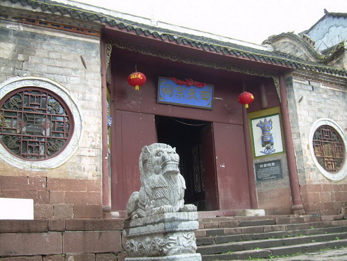 這是一處具有濃厚民族特色的建筑群,有大門、正殿、戲臺(tái)20多間屋宇,并有天井、天池、回廊,還設(shè)有“五福”、“六順”兩門。